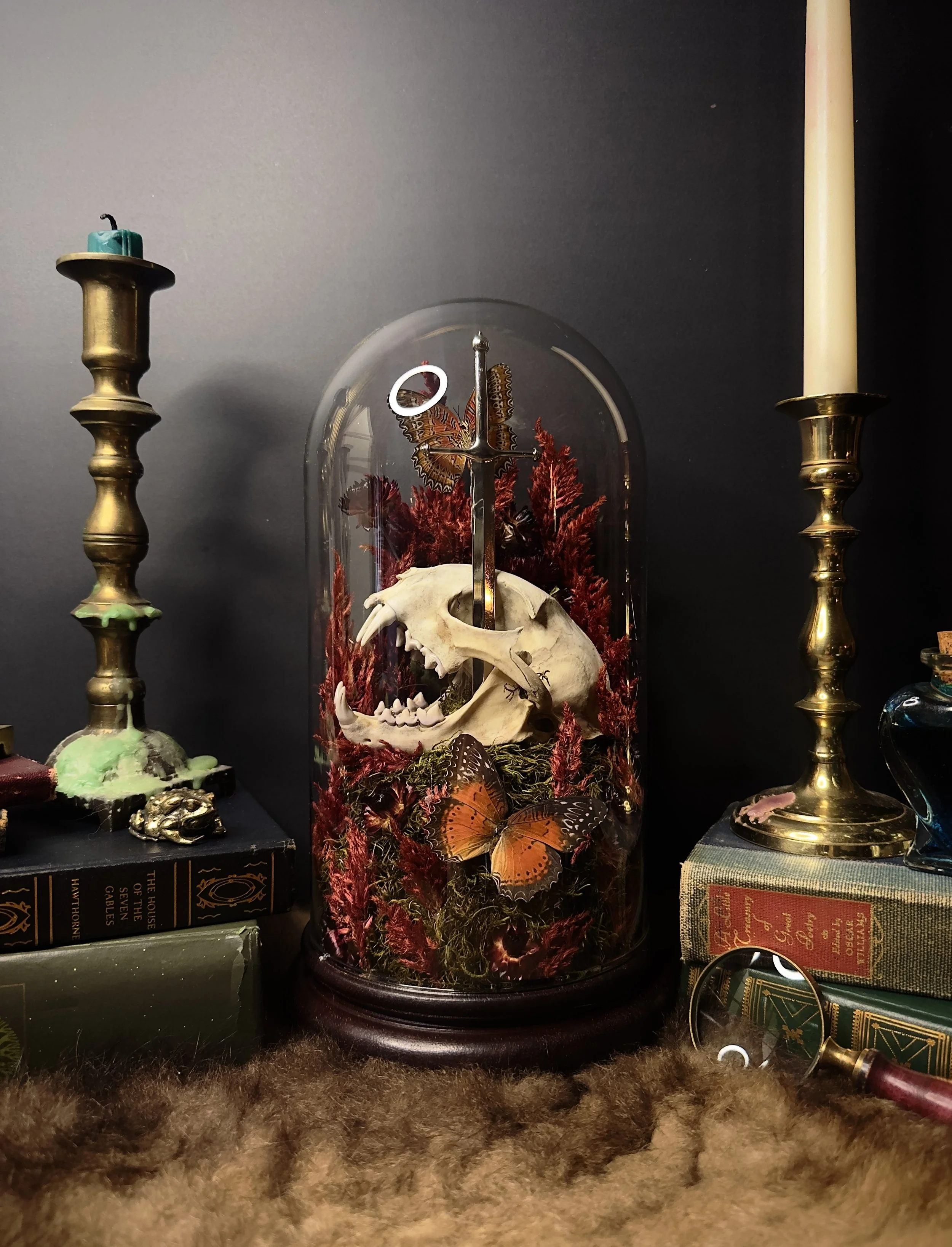 All of our Butterfly and insect Displays are hand-crafted by my sister and I. About 98% of materials used are all natural, we even forage for some ourselves. We will occasionally use a faux mushroom or replica skull for example, but this will always be stated in the item description. We try our best to only order our insects from sustainable insect sellers. We also spread and dry the insects ourselves. They are beautiful magical worlds encased in a Glass Dome (or frame) to give the butterflies a second life. Most butterflies only live a couple weeks to a month after all.