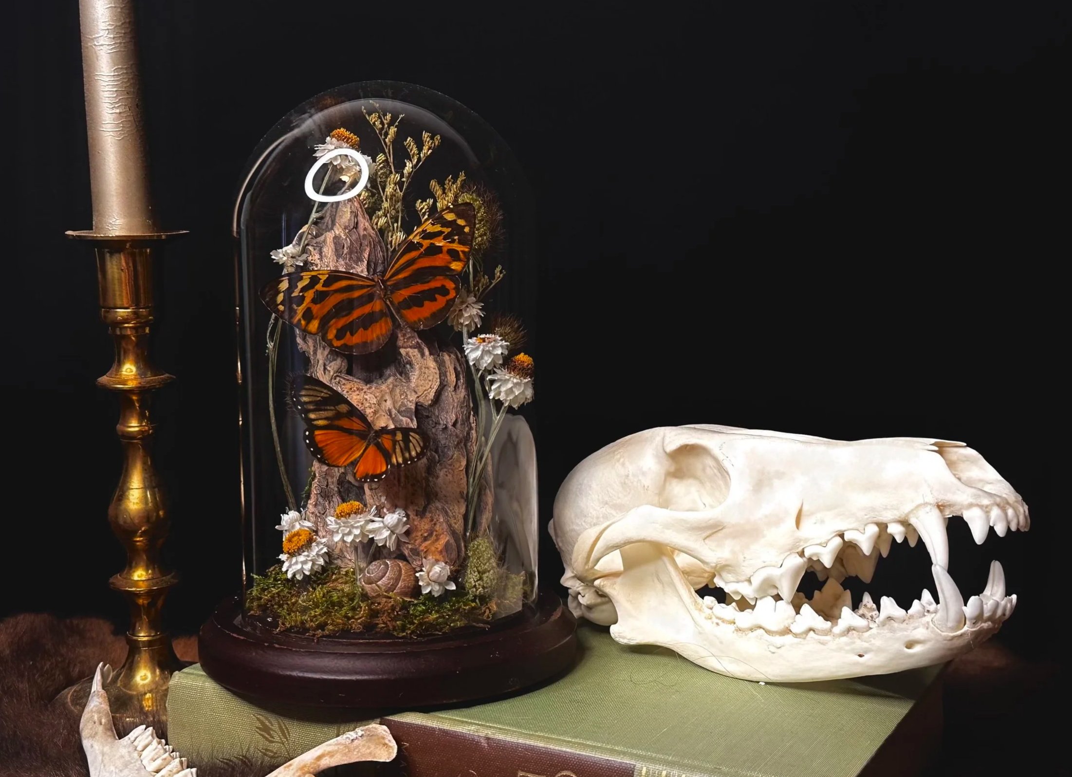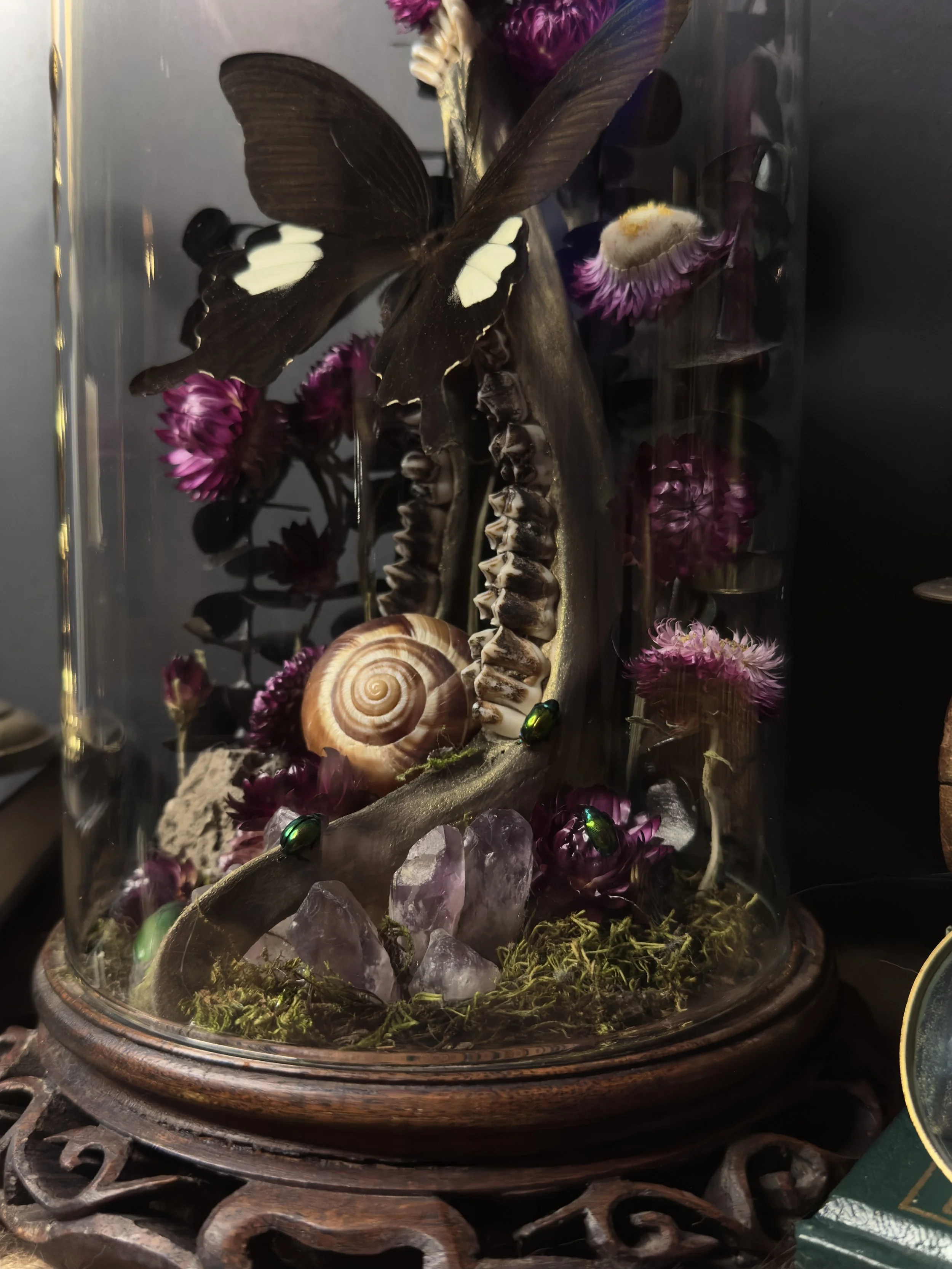 With our art we hope to convey the beautiful cycle of nature reclaiming its own after death. Bones taken over by moss, and insects crawling amongst it all. Eventually all living things are brought back to the earth to complete the circle of life.
